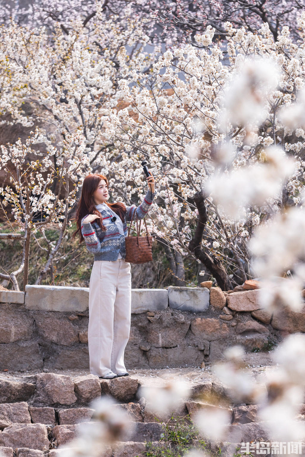 游客与春色拍照。