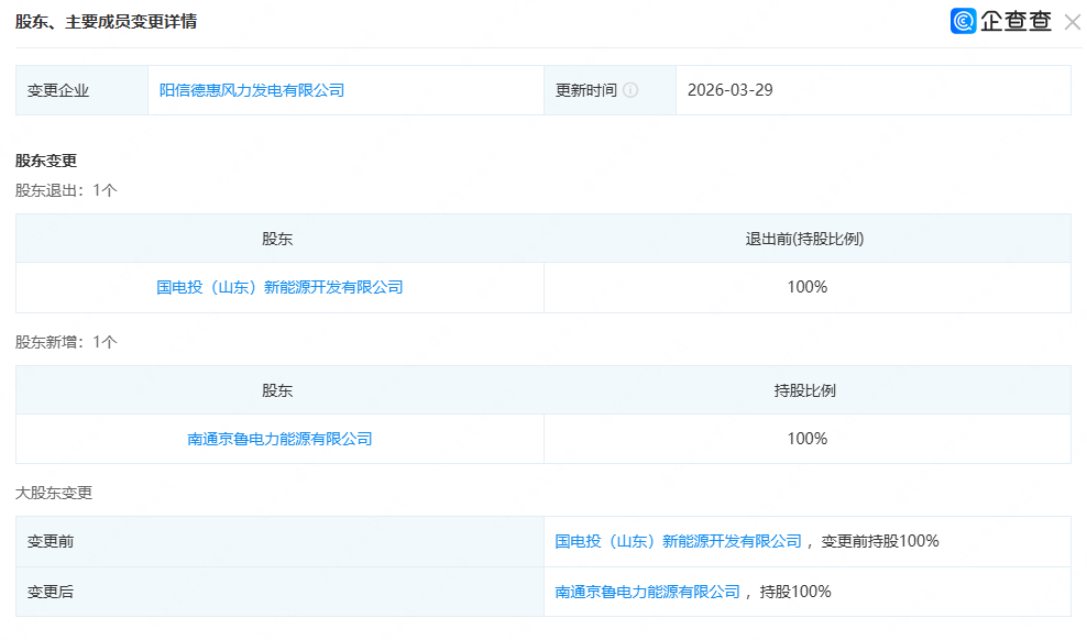 企查查App显示,3月29日,阳信德惠风力发电有限公司发生股东变更:原持股100%的国电投(山东)新能源开发有限公司退出,由南通京鲁电力能源有限公司接盘。与此同时,该公司总经理也由邢成关变更为王鲁任。
