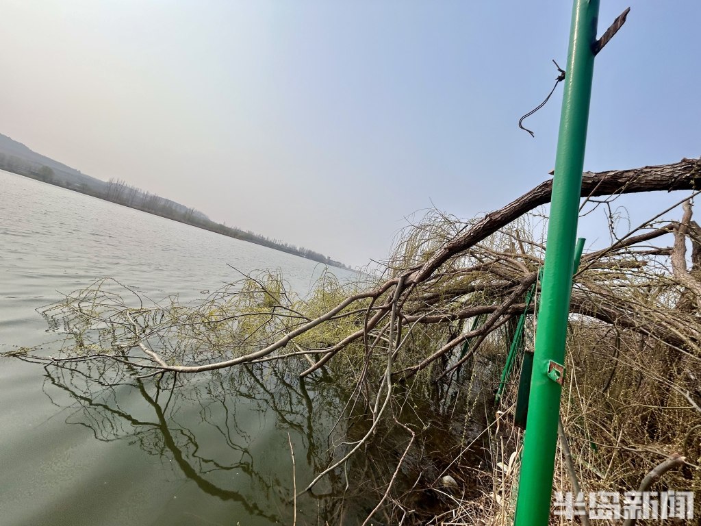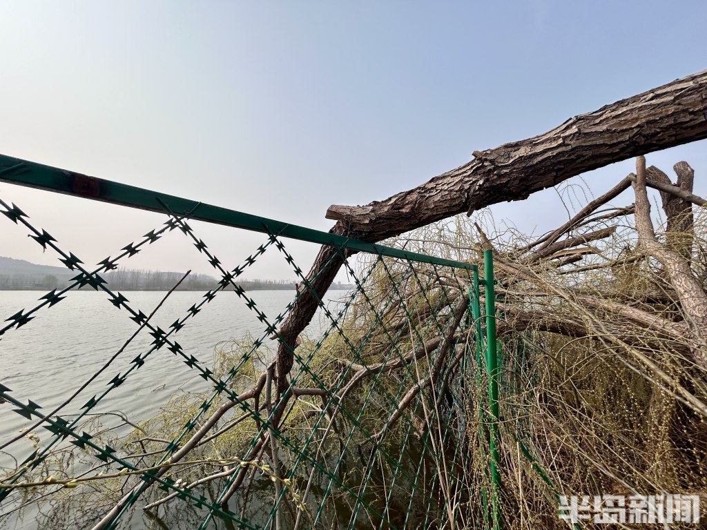 春天来临,平度市双庙水库边上的20多棵大柳树被拦腰斩断。斩断的树冠落入水中,粗树干砸歪了相关部门在水库边设立的铁护网。