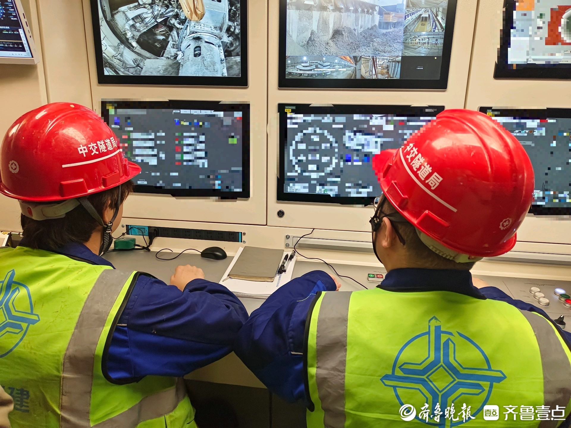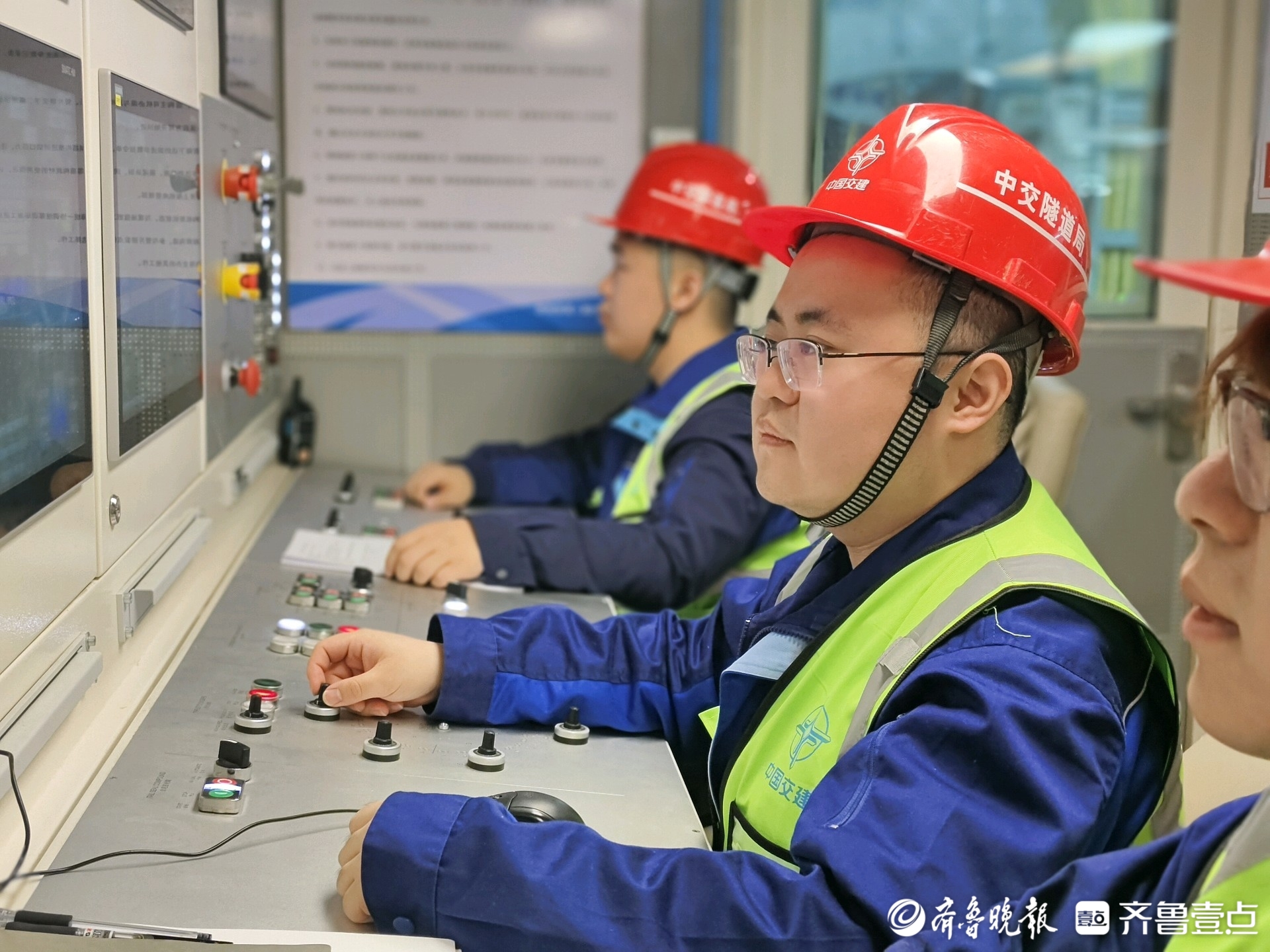 3月28日,陈林与班组同事在“征程号”盾构机驾驶室做掘进前的最后准备工作。