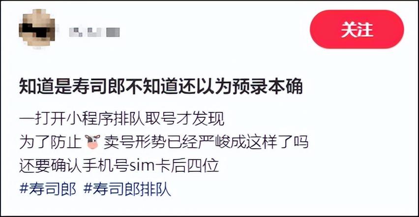 近日,有网友发文称,在寿司郎小程序预约取号后,到店签到需要核验手机尾号后4位,并出示手机SIM卡尾号。