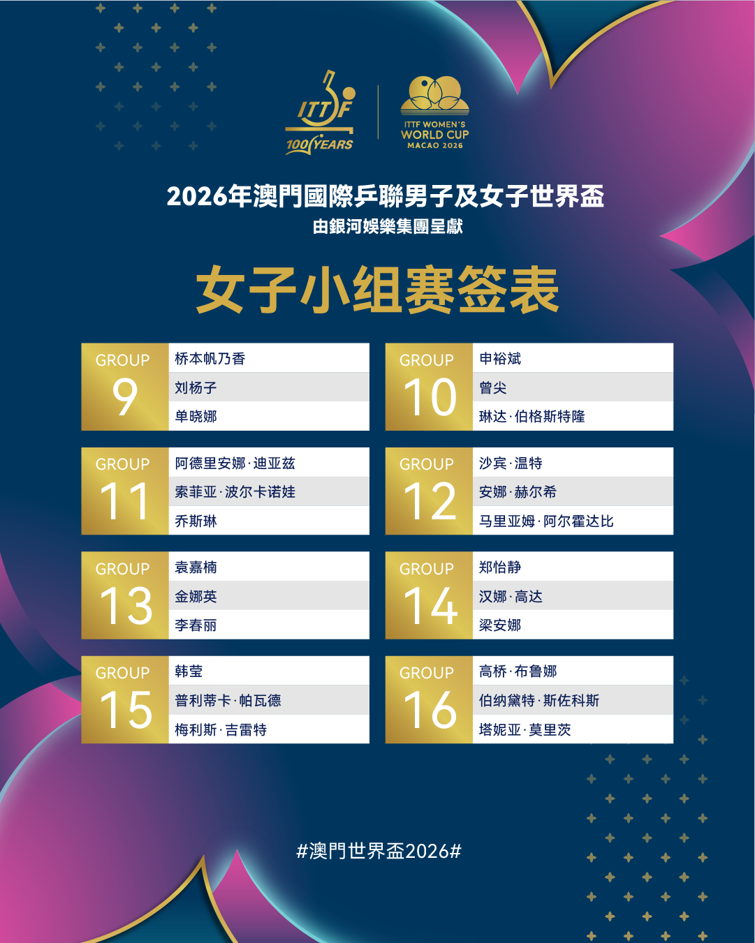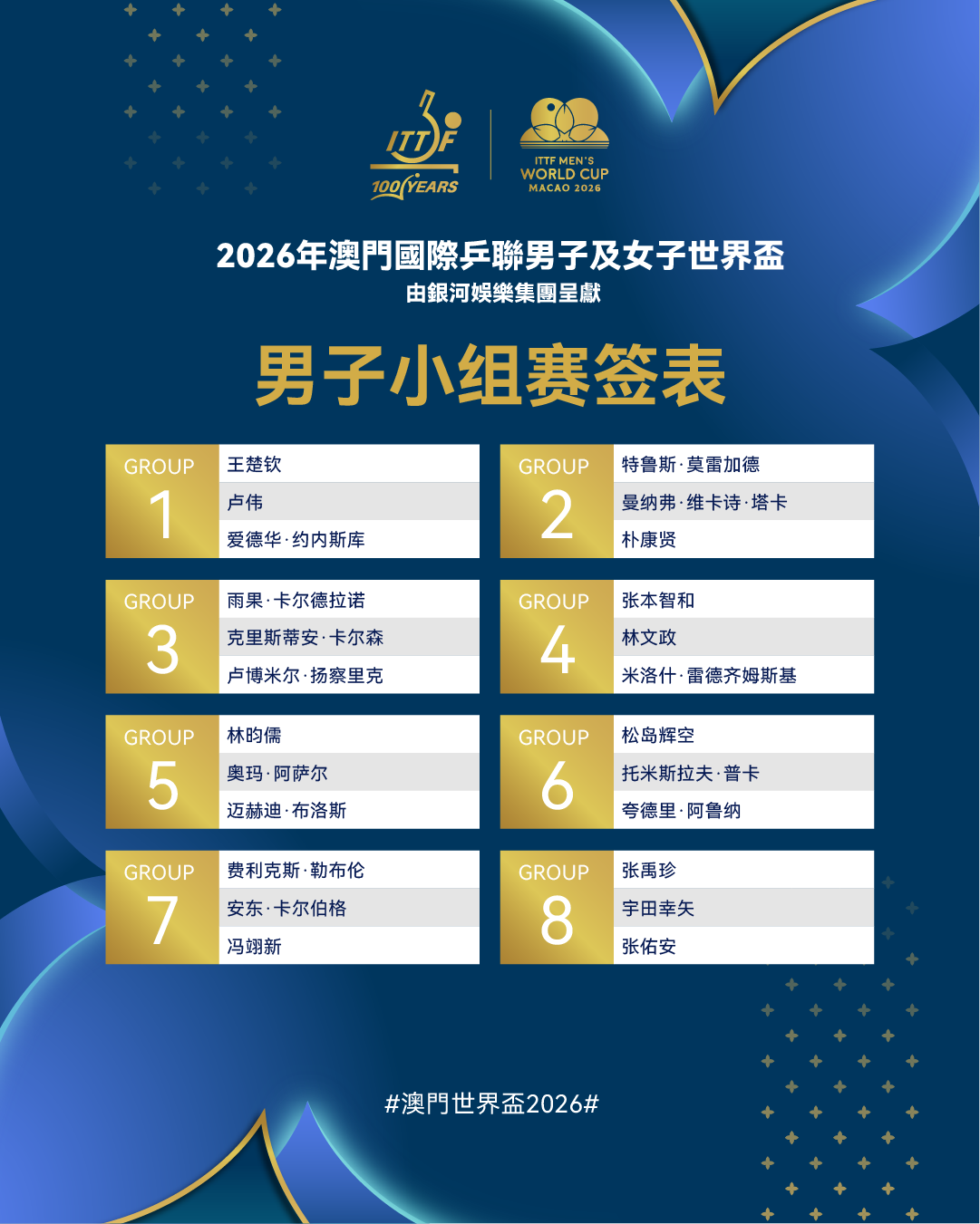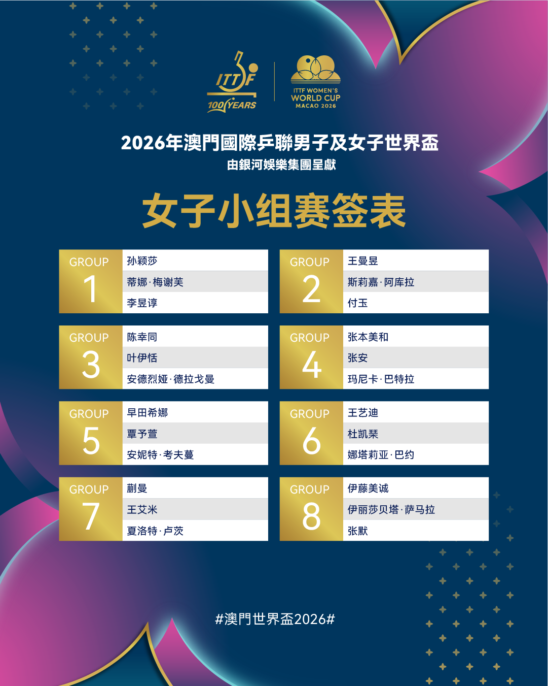 2026年澳门国际乒联男子及女子世界杯将于3月30日至4月5日在中国澳门银河综艺馆举行。届时,来自五大洲的男、女各48位顶尖运动员们将展开激烈角逐,本次赛事小组赛签表已出炉。男子小组赛签表如下:女子小组赛签表如下:比赛将于明天正式打响预祝所有运动员取得优异成绩!(国际乒联)