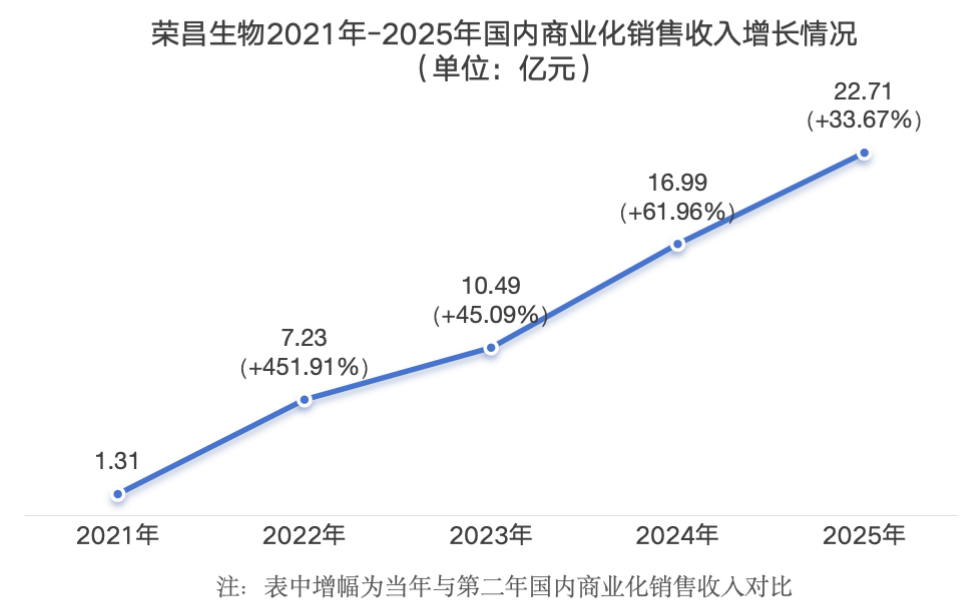 而从长期增长轨迹来看,荣昌生物2021年-2025年以来国内商业化销售收入始终保持稳步攀升态势,从2021年的1.31亿元增长至2025年的22.71亿元,增幅达1633.59%,这一跨越式增长,进一步印证了核心产品商业化落地的扎实成效。