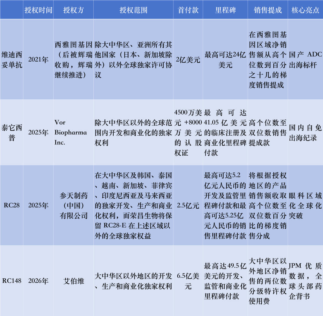 而除了RC148 的重磅合作,维迪西妥单抗、泰它西普、RC28 也已先后完成多区域全球授权,覆盖肿瘤、自免、眼科全赛道,具体核心交易细节如下: