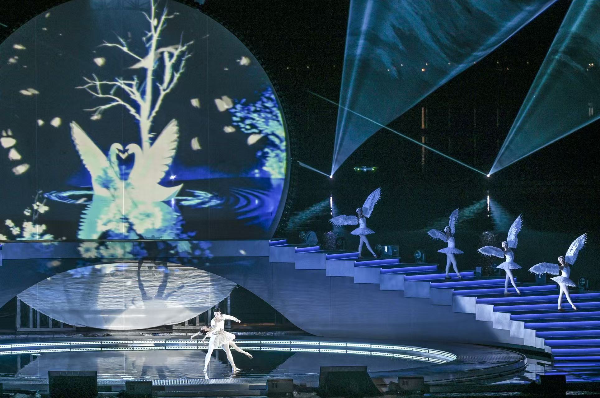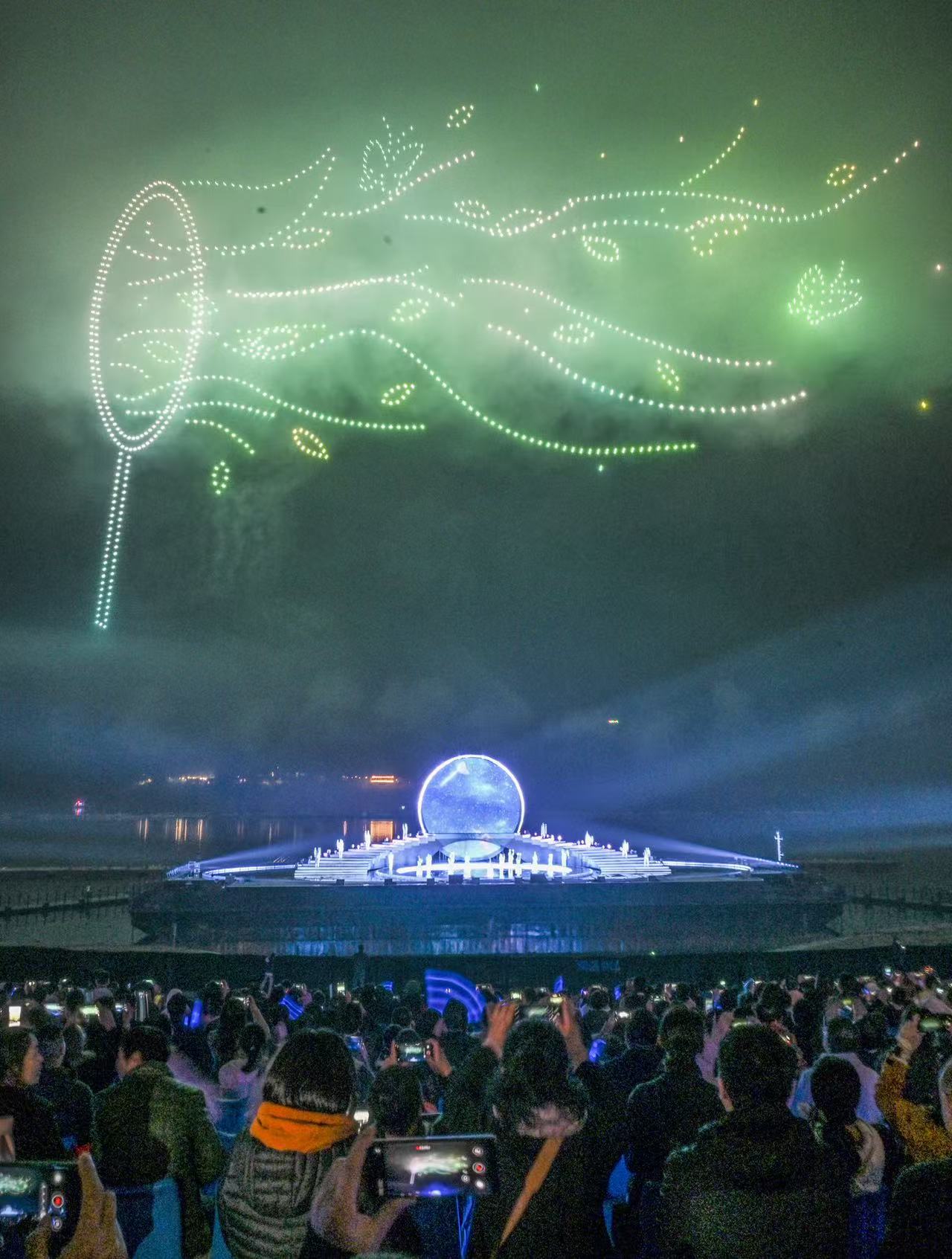 当夜幕低垂,重头戏“春日花火”大型沉浸式焰火秀震撼上演,烟花演绎新的艺术高度!第一篇章《春日画布》联动梵高经典画作与他独特的24小时,用烟花致敬艺术巨匠不灭的激情与梦想。千架无人机搭配焰火同步腾空、联袂起舞,以夜空为画布,以水火为笔墨,恢弘呈现超大规模沉浸式天空艺术展演:梵高经典名画《星月夜》浪漫流转、璀璨星河铺满天际,《向日葵》明艳绽放、向阳而生定格绝美光影;第二篇章《春日舞会》联动世界名舞《天鹅湖》,烟花渲染的漫天羽翼随着舞蹈演员的灵动舞步轻盈律动。在第三篇章《春日交响曲》中,川江号子的呼唤与世界民族交响舞曲——《黄河》交响曲磅礴雄浑的激昂节奏产生碰撞,烟花便在两者的节奏交汇中层层绽放。从创意到互动,从视觉到情感,观众都感受到了超越传统的焰火魅力。