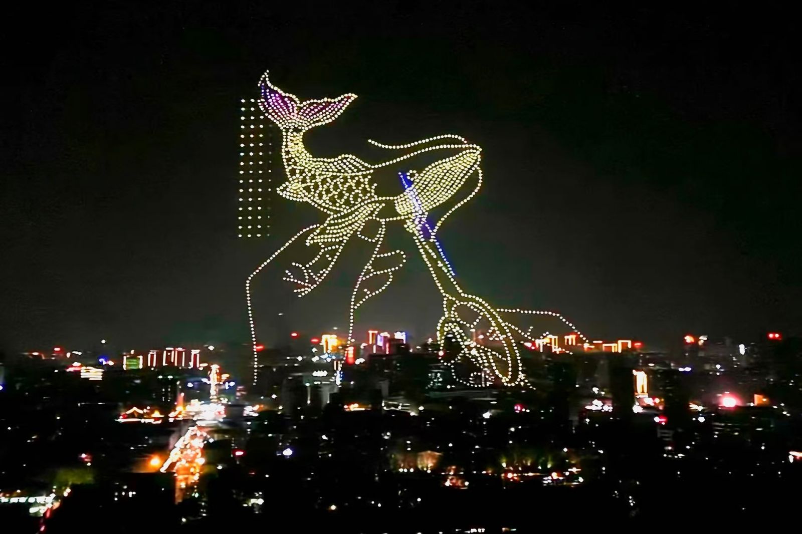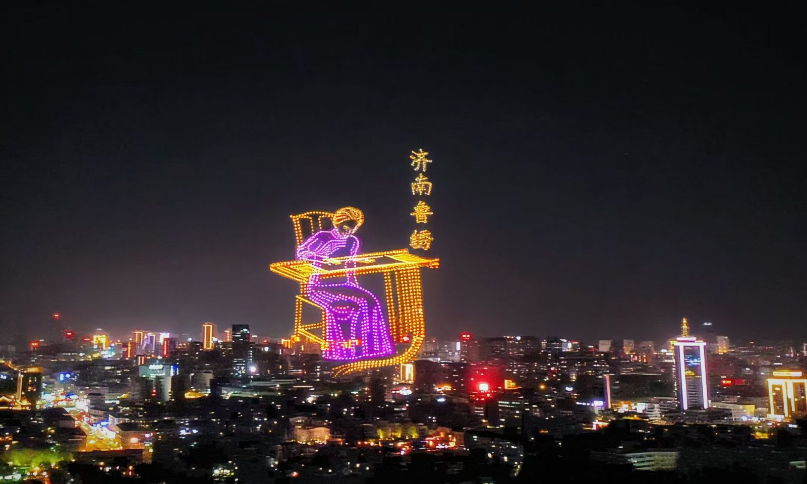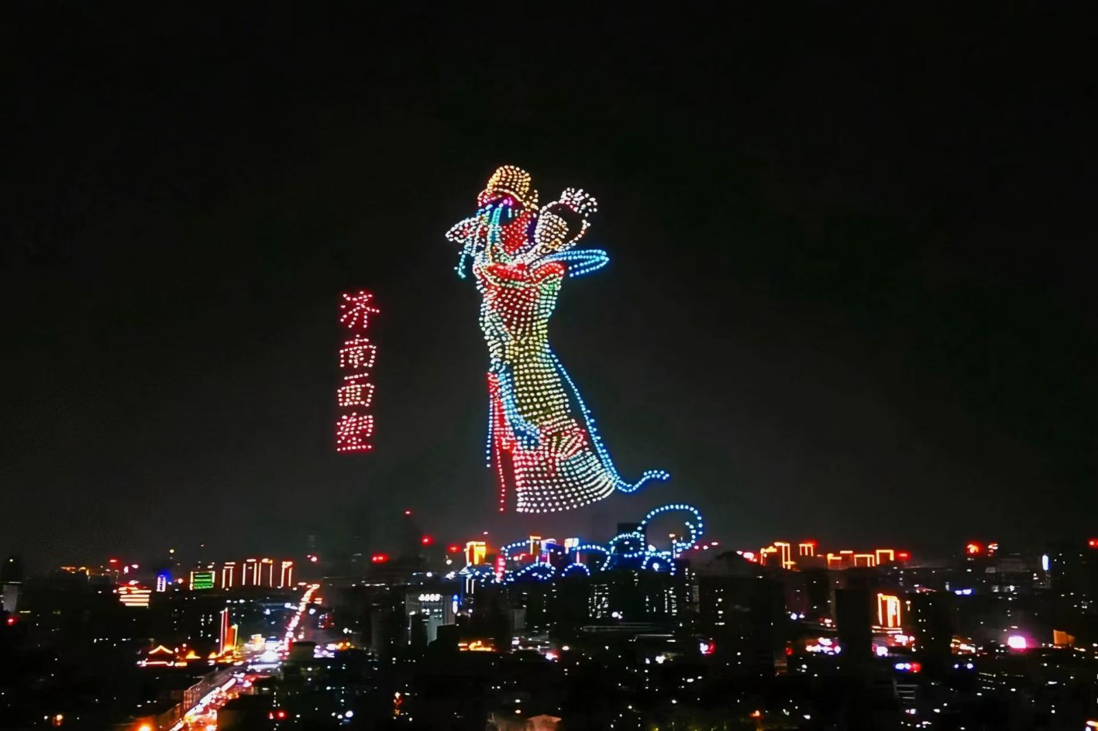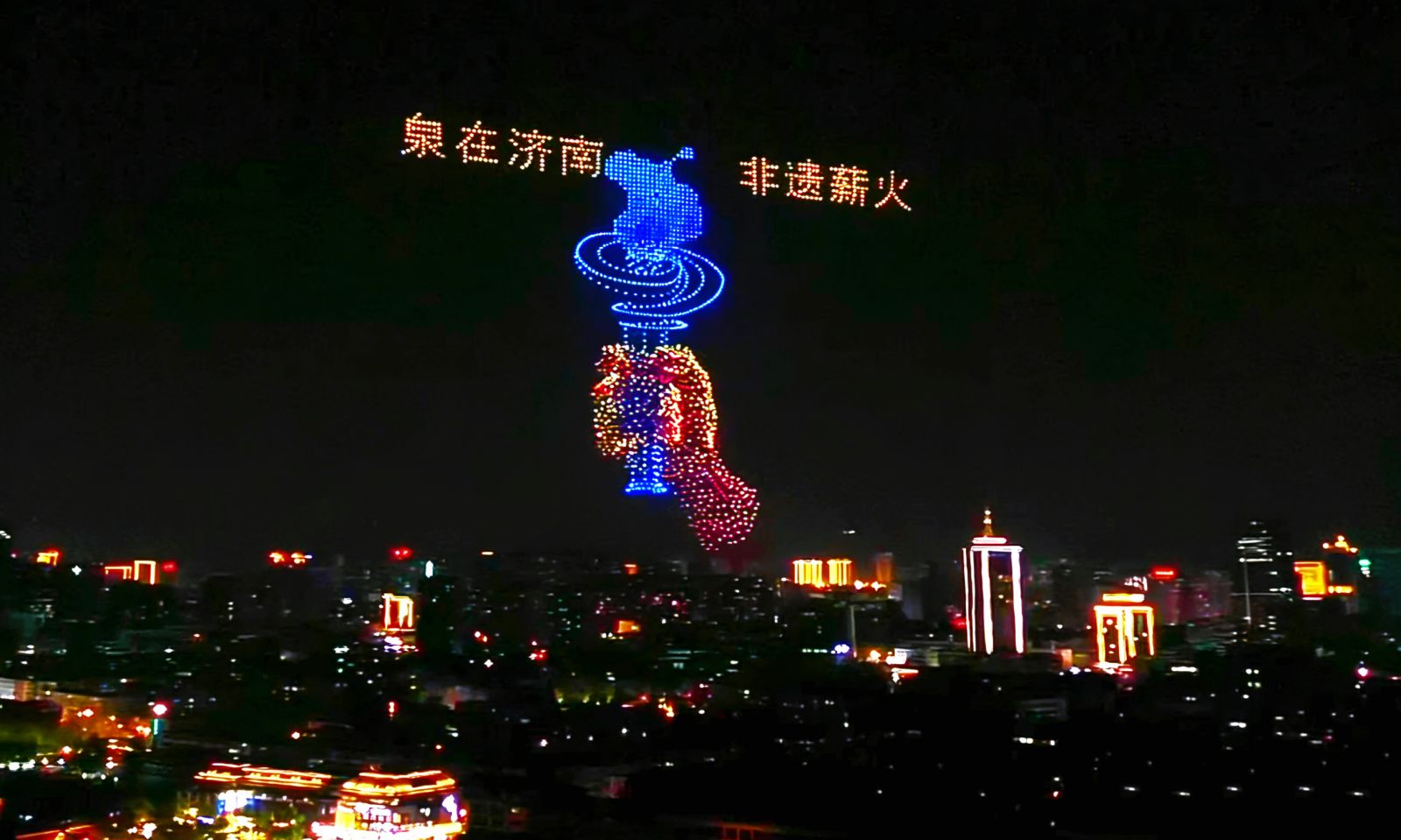 3月29日晚,济南超然楼前人潮涌动、惊呼不断。一场以“泉在济南 非遗薪火”为主题的无人机灯光秀在夜空中上演,数千架无人机腾空而起,以天为幕、以光为笔,生动呈现鼓子秧歌、章丘芯子、鲁绣、剪纸等济南特色非遗项目,为市民游客带来一场科技与文化交融的视觉盛宴。作为“泉在济南·星耀长空”常态化低空表演项目的又一佳作,本次活动由中共济南市委宣传部指导,济南低空经济发展集团、济南广播电视台携手打造,旨在以科技赋能文化传播,助力济南“非遗名城”建设。