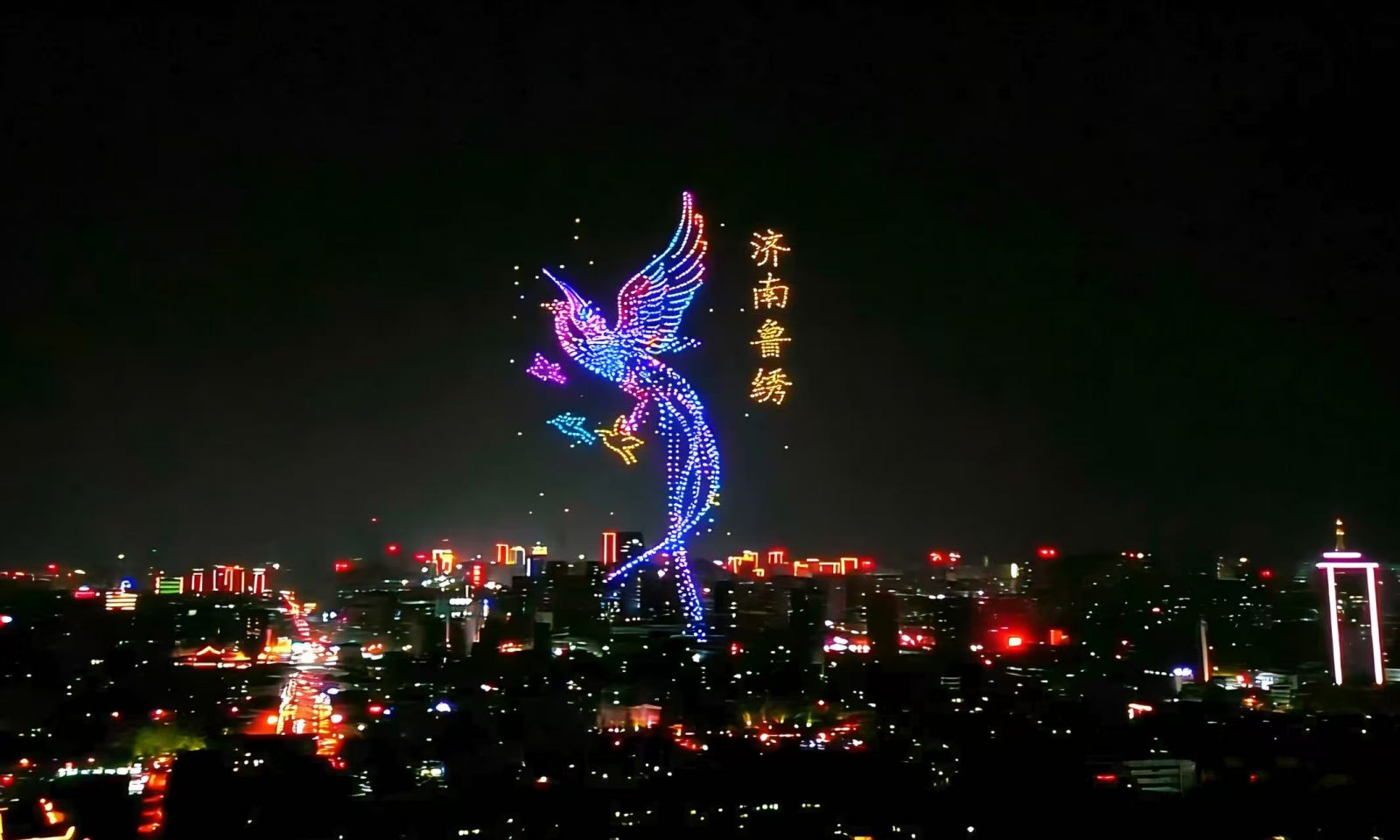 表演在此时推向高潮。一位鲁绣绣娘款款“入座”,在绣布上绣出一只飞鸟,飞鸟随即腾空而起,汇集成百鸟朝凤的壮丽画卷。随后,无人机群化作一个个像素点,共同编织出济南剪纸的意象,指尖流转间,一只鲲鹏直冲云霄,象征着济南在全省高质量发展中“站排头、担大任”的时代担当。