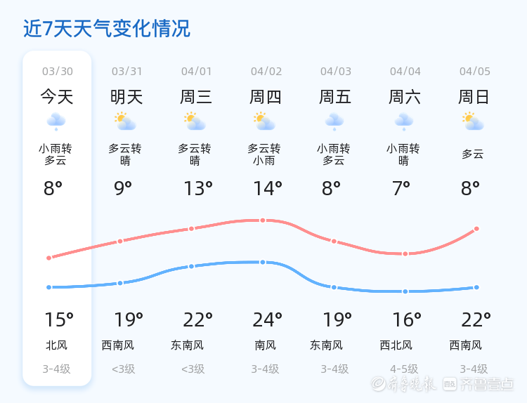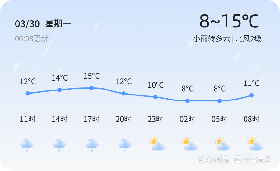 今天是3月30日,农历二月十二,菏泽市迎来了一轮小雨转多云的天气。全市各区的气温在8℃至15℃之间,北风2级,空气湿度为62%,PM2.5指数为88,空气质量良好。当前温度为15.3℃,天气状况为小雨转多云,市民出行需注意携带雨具。
