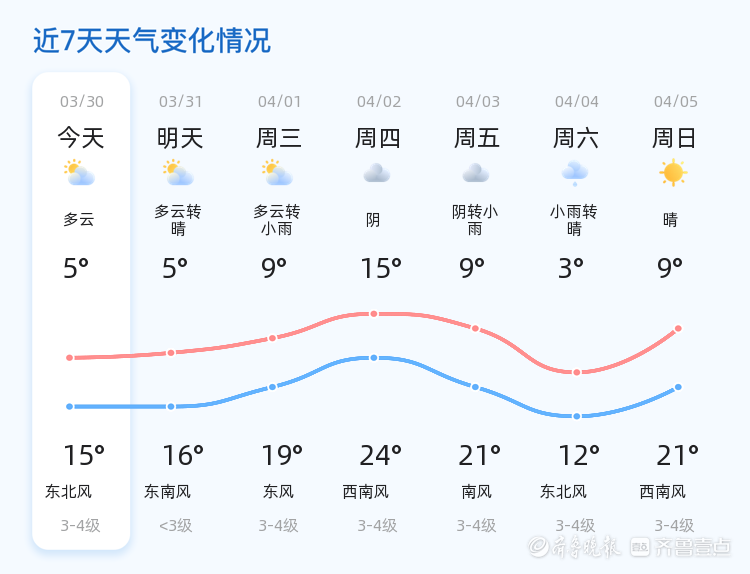 明天3月31日,德州的天气将由多云转为晴天。与今天相比,明天的最高气温略有上升,达到16℃,最低气温仍为5℃。风力方面,东南风风力较小,仅为小于3级。市民朋友们可以期待一个更加晴朗的天气,适合户外活动和晾晒衣物。