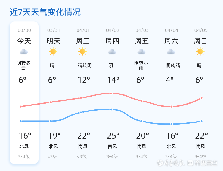 今天是3月30日,星期一,农历二月十二。聊城市的天气以阴转多云为主,气温介于6℃至16℃之间,东北风3级,空气湿度为74%,PM2.5指数为114。各区天气情况基本一致,整体较为平稳。