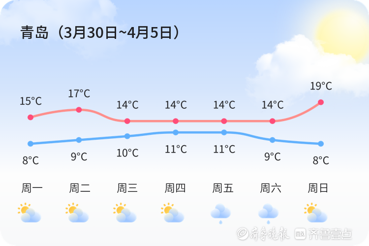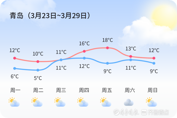 全市周平均最高温13℃,平均最低温9℃,平均气温11℃,周最高气温18℃,出现在周五,周最低温5℃,出现在周二。