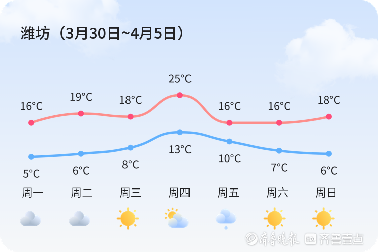 全市周平均最高温18℃,平均最低温7℃,平均气温13℃,周最高气温25℃,出现在周四,周最低温5℃,出现在周一。