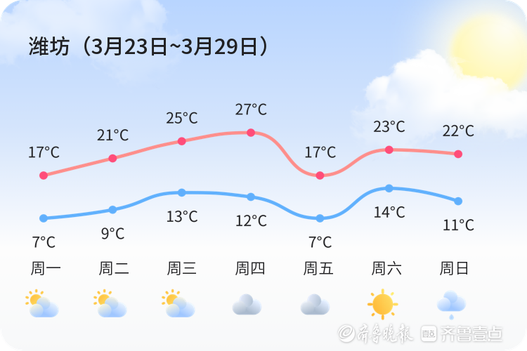 最低气温7~14℃,最高气温17~27℃。空气质量方面总体轻度污染,空气质量状况有点糟糕,注意戴口罩哦~