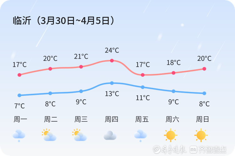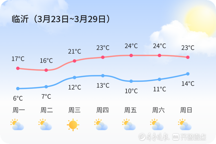 全市周平均最高温21℃,平均最低温10℃,平均气温15℃,周最高气温24℃,出现在周五、周六,周最低温6℃,出现在周一。
