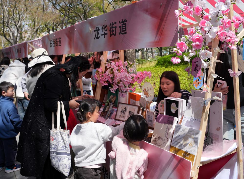 [신화망 중국 상하이 3월29일] 28일 시민과 관광객이 상하이 쉬후이(徐匯)구 차오시(漕溪)공원에 마련된 장터에서 문화콘텐츠 상품을 구매하고 있다.