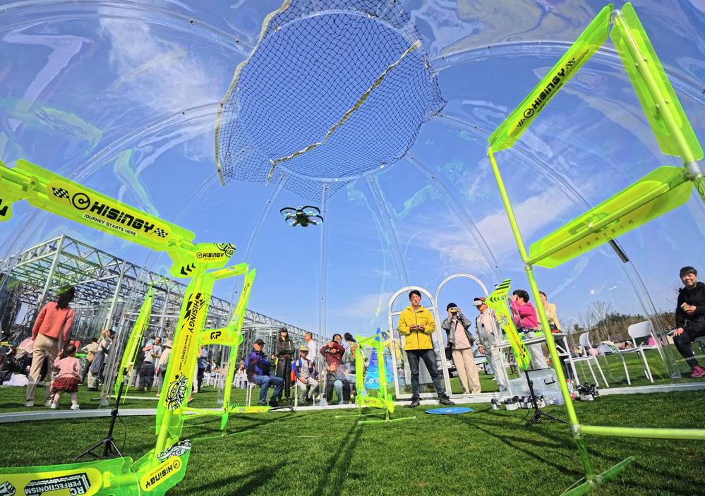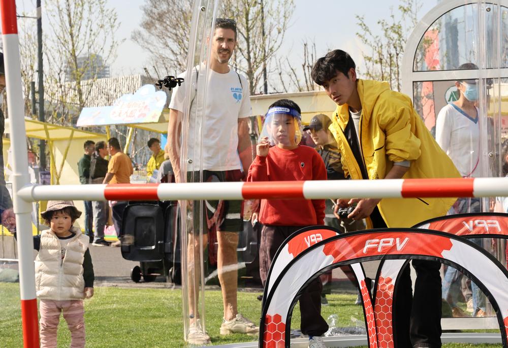 [신화망 중국 상하이 3월29일] '솽쯔산(雙子山) 벚꽃시즌 드론 카니발' 행사가 28일 상하이 엑스포 문화공원 잔디밭에서 진행됐다. 많은 시민과 관광객이 현장에서 1인칭 시점(FPV) 드론 장애물 비행, 드론 비행 퍼포먼스 등을 감상하며 즐거운 한때를 보냈다.