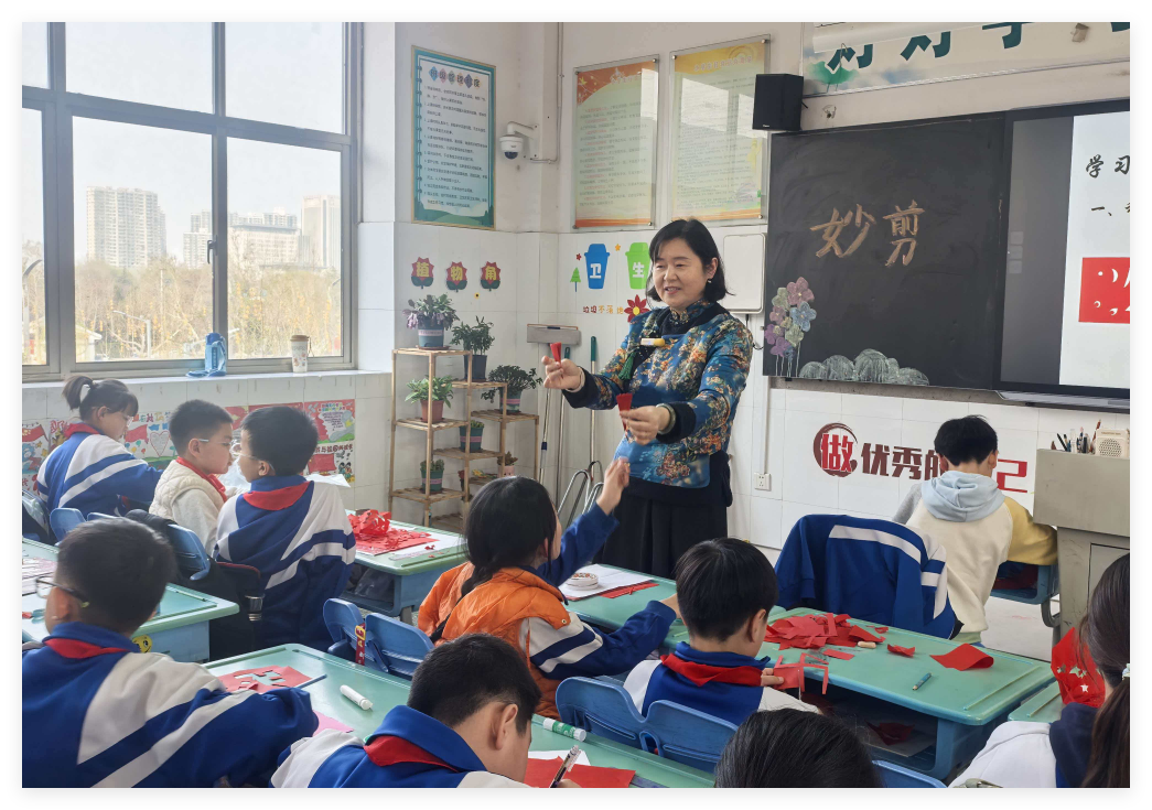 在实操环节,她手把手指导学生握剪、折纸、刻画,耐心示范剪纸技巧,带领孩子们沉浸式体验剪纸创作的乐趣,感受传统技艺的独特魅力。