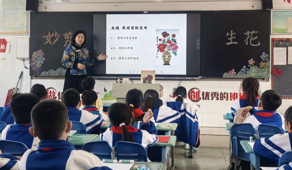 活动现场,周艳丽以授课老师的身份,走进菏泽市第一实验小学育才路校区四年级(3)班课堂,用生动通俗的语言,细致讲解剪纸艺术的历史脉络与文化底蕴,将非遗知识化繁为简、寓教于乐。