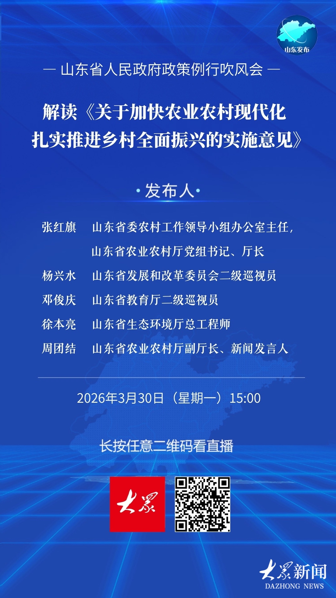 山东省人民政府新闻办定于3月30日(周一)下午15:00举行省政府政策例行吹风会,邀请省委农办、省农业农村厅主要负责同志等解读《关于加快农业农村现代化扎实推进乡村全面振兴的实施意见》。(大众新闻记者崔晗高广超)
