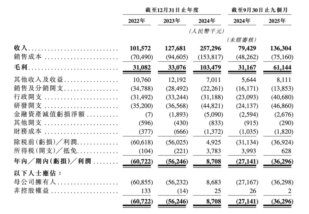 其招股书披露的财务数据显示,2022年至2025年前三季度,极视角科技分别实现营收1.02亿元、1.28亿元、2.57亿元、1.36亿元,归母净利润分别为-6072.2万元、-5624.6万元、870.8万元、-3629.6万元。