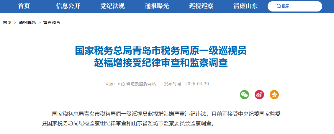 国家税务总局青岛市税务局原一级巡视员赵福增被查打虎拍蝇猎狐 | 2026-03-30 16:28:50 微信扫码扫码下载客户端3月30日,据山东省纪委监委网站消息:国家税务总局青岛市税务局原一级巡视员赵福增涉嫌严重违纪违法,目前正接受中央纪委国家监委驻国家税务总局纪检监察组纪律审查和山东省潍坊市监察委员会监察调查。责任编辑:李思羽