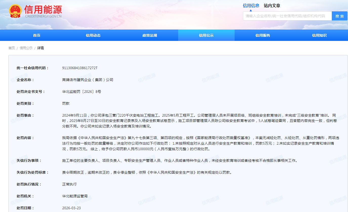 近日,信用能源公示了高碑店市建筑企业(集团)公司的行政处罚决定。处罚决定书文号华北监能罚〔2026〕8号显示,2024年9月11日,该公司承包三营门220千伏变电站工程施工。2025年5月工程开工。公司管理层人员未开展项目级、班组级安全教育培训,未完成“三级安全教育”培训。 同时,2025年8月27日至30日的安全教育记录表及入场安全教育试卷显示,施工项目部管理层人员陈公司级安全教育考试中,5人试卷笔迹雷同,且答题内容完全一致,但判卷分数不同。该公司未如实记录入场安全教育及培训情况。