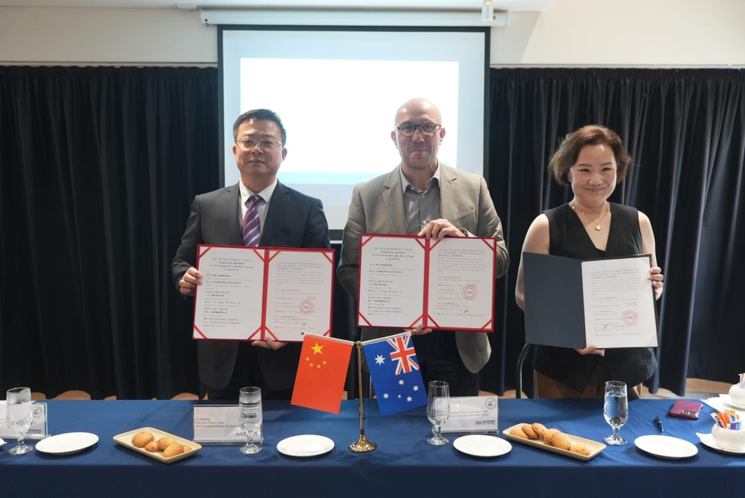 现场,烟台文化旅游职业学院党委书记吕世强、墨尔本理工学院运营执行总监Marc Blanks、山东妈妈餐饮有限公司董事长侯欣彤作为三方代表共同签署合作协议,正式确立班·墨学院共建合作关系,各方相关人员共同见证这一跨国校企合作的重要时刻。