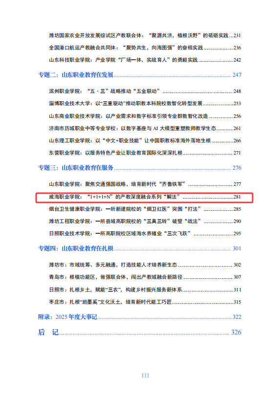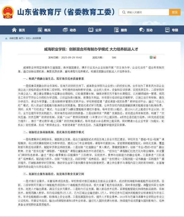 近日,山东省教育厅发布《山东省职业教育质量报告(2025年度)》,威海职业学院“1+1+1+N”产教融合模式的实践做法入选“山东职业教育在服务”系列专题,这是继学校产教融合指数进入东部地区高职前10%之后,再次获得省级教育主管部门的认可。