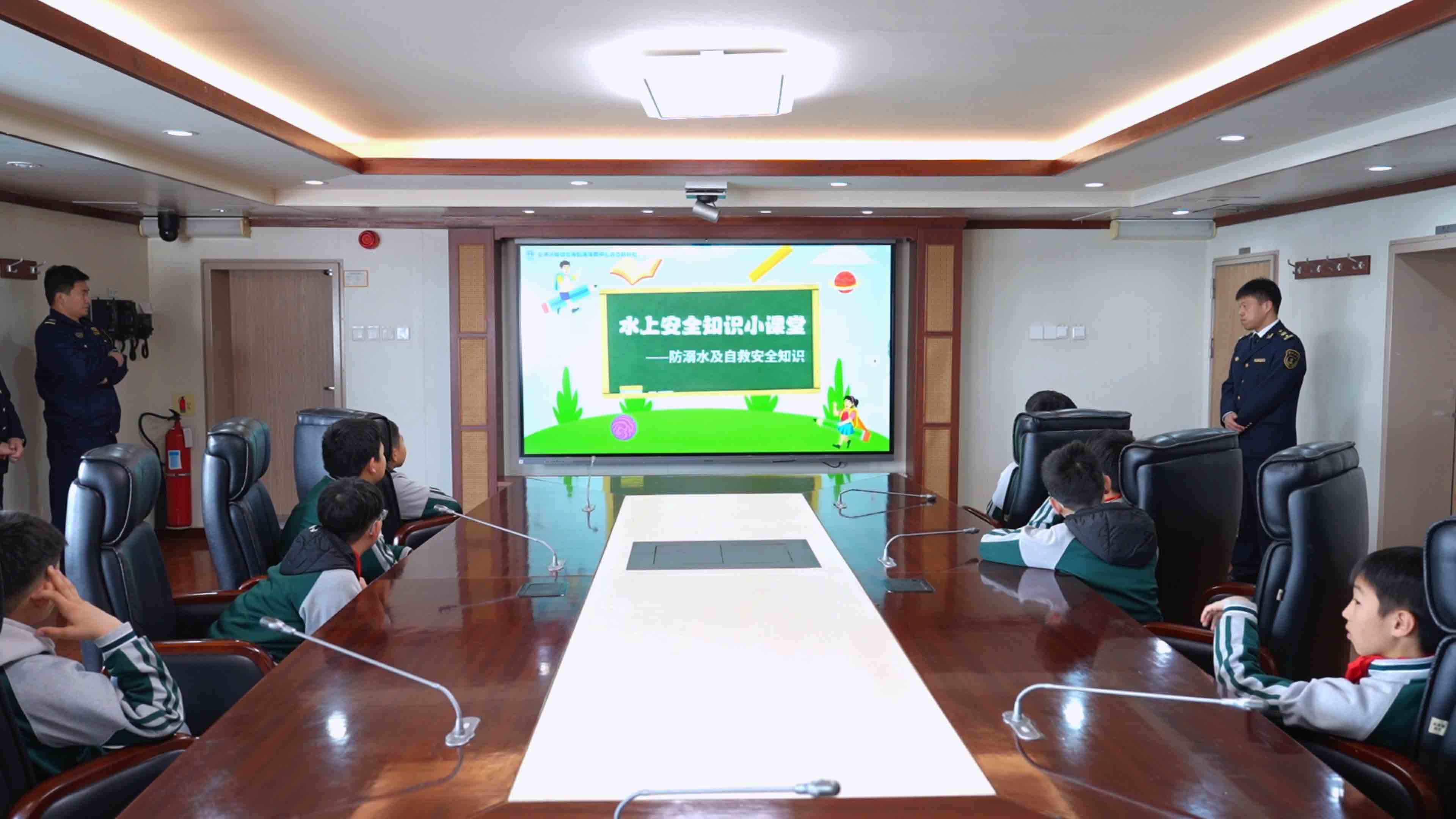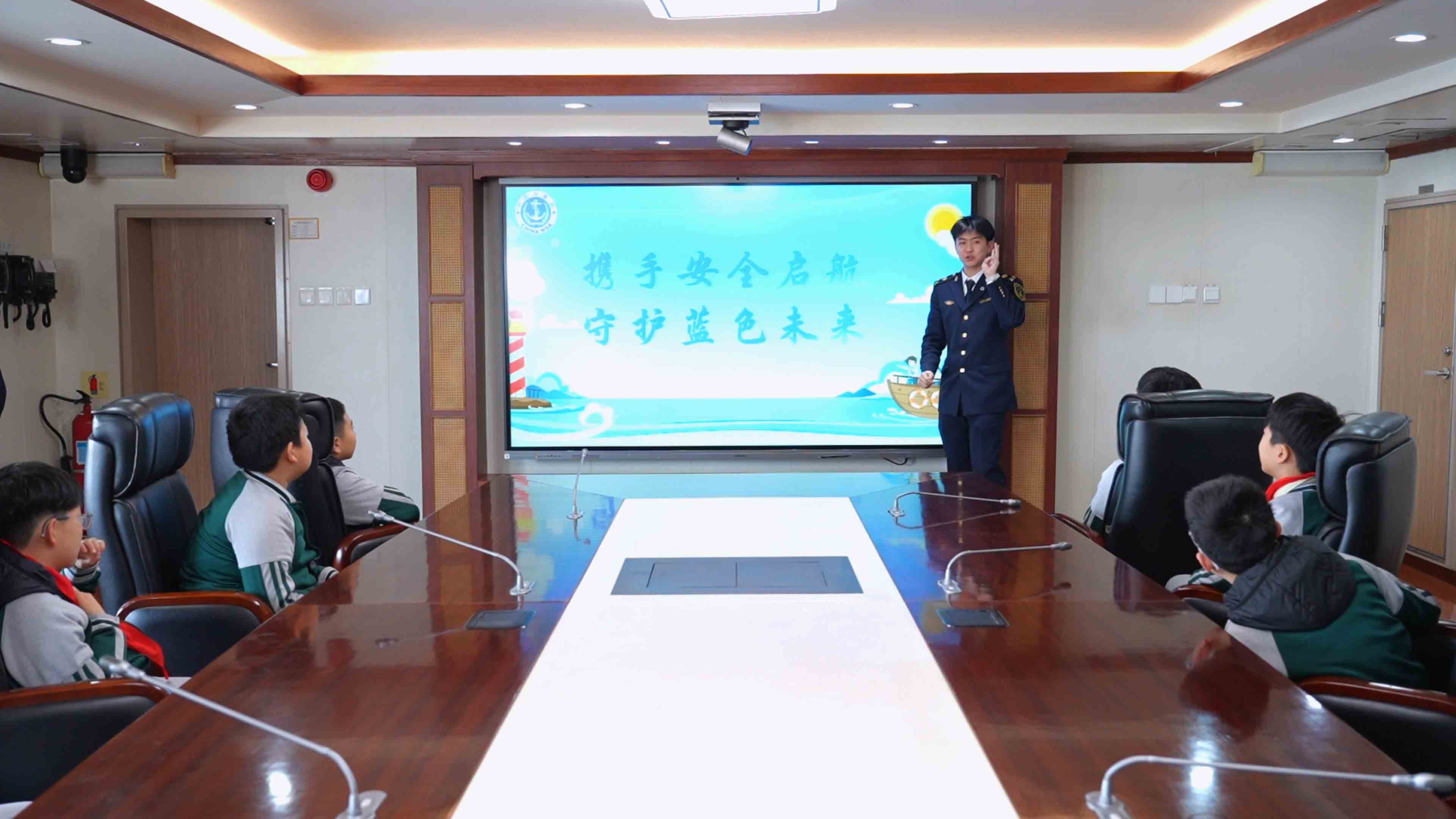 上午9时许,活动在庄严的“登轮仪式”中拉开帷幕。在“生命课堂”环节,同学们首先观看了防溺水安全教育动画短片,生动的画面将水上安全知识深入浅出地呈现出来。随后,航标处工作人员化身“海上交通警察”,讲解了航标作为海上“红绿灯”的神奇作用;海事局执法人员则围绕水上交通安全常识、乘船注意事项等内容,与同学们展开互动问答,课堂气氛热烈。