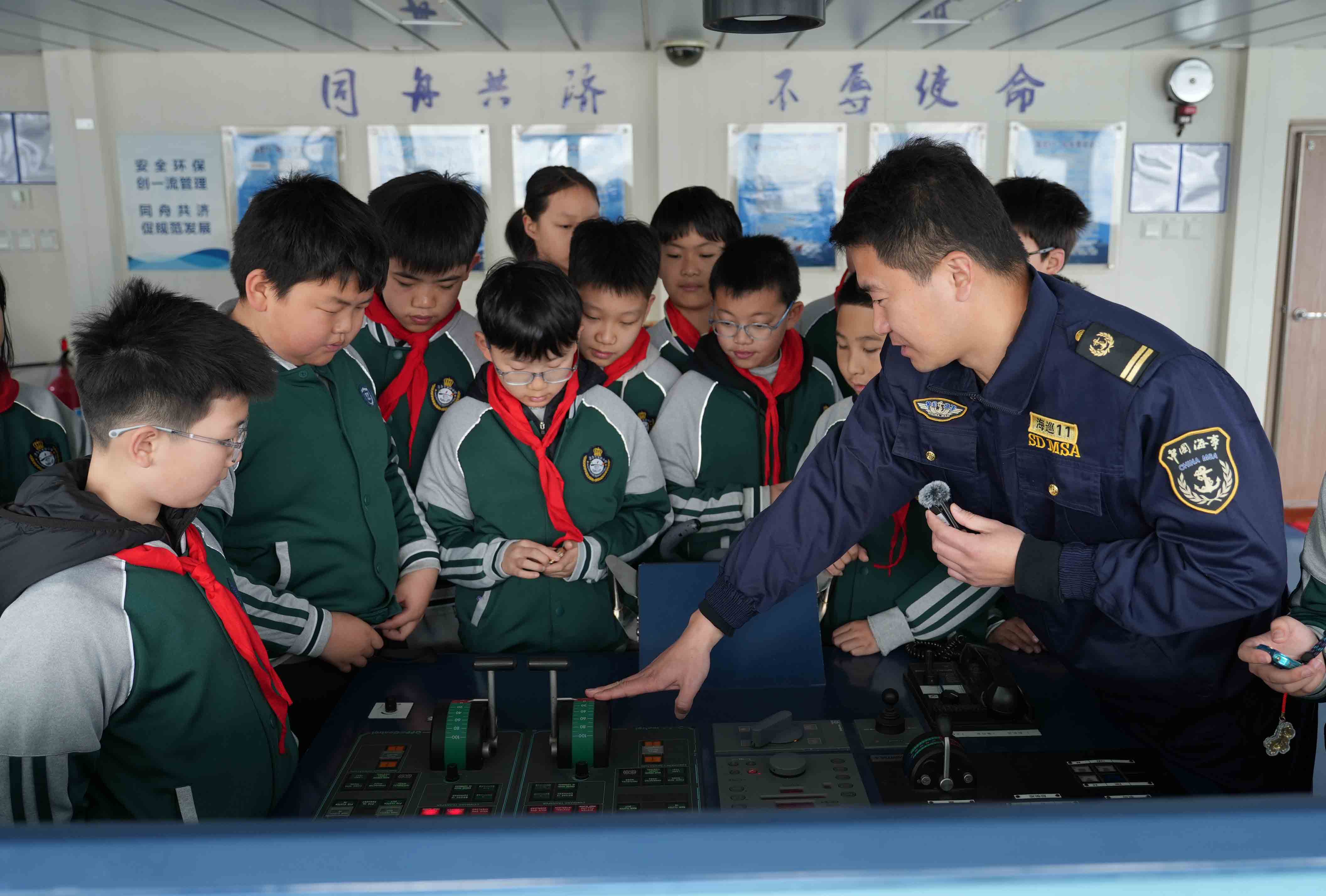 在“探秘海巡11”环节,同学们分组走进船舶驾驶台。雷达屏幕上的光点、罗经的精准指向、先进的通讯设备……一切对于孩子们而言都充满了新奇与神秘。在工作人员的指导下,同学们轮流体验了“小小船长”的角色,手握舵轮,眺望远方,眼神中充满了对海洋的向往与敬畏。随后,大家参观了船舶生活区,近距离了解船员叔叔们在海上的日常工作和生活,对这份守护海上安全的职业有了更真切的感受。