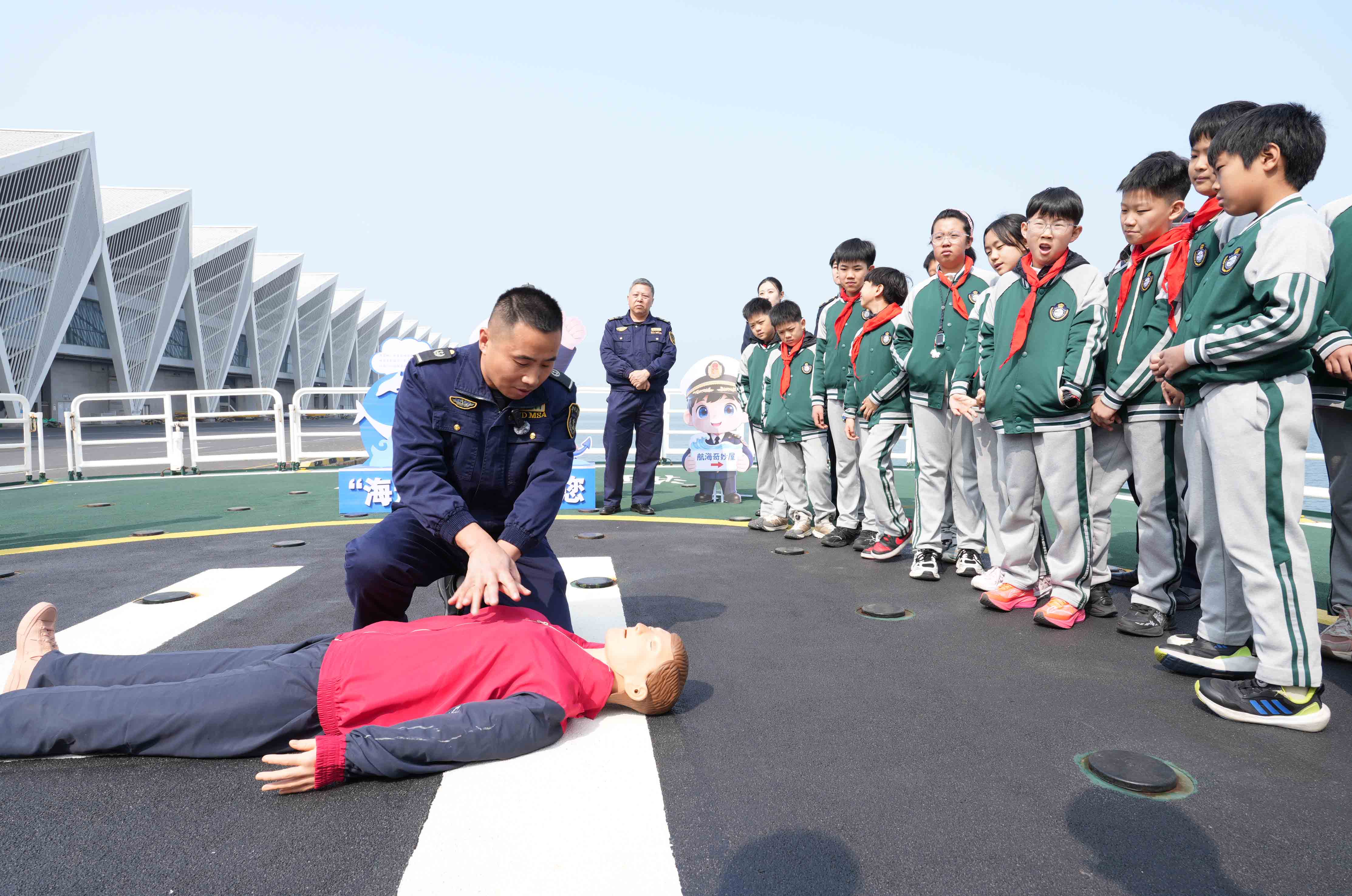 在后甲板及直升机平台上,一场生动的“甲板实训”将活动推向高潮。工作人员首先演示了救生衣的标准穿着方法:展开救生衣、套入双臂、调整松紧、系好腰带和胸带、吹响口哨……每一个步骤都细致入微。演示结束后,同学们跃跃欲试,分组进行穿戴比赛。在紧张而有序的比拼中,同学们不仅掌握了救生衣的正确使用要领,更深刻理解了“时间就是生命”的救援真谛。