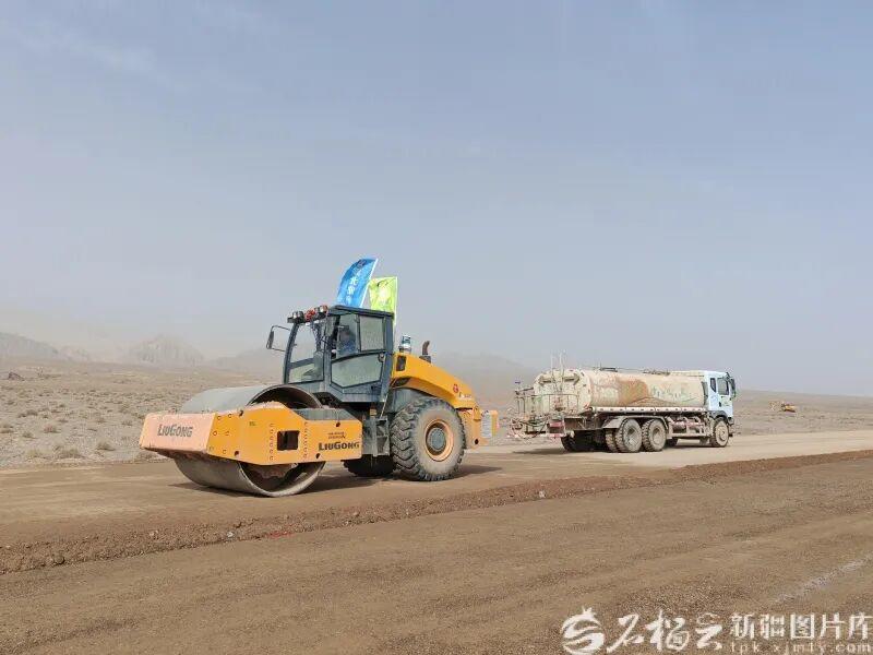 3月28日,施工人员驾驶压路机在G581线喀什至乌恰公路建设项目现场碾压路面。