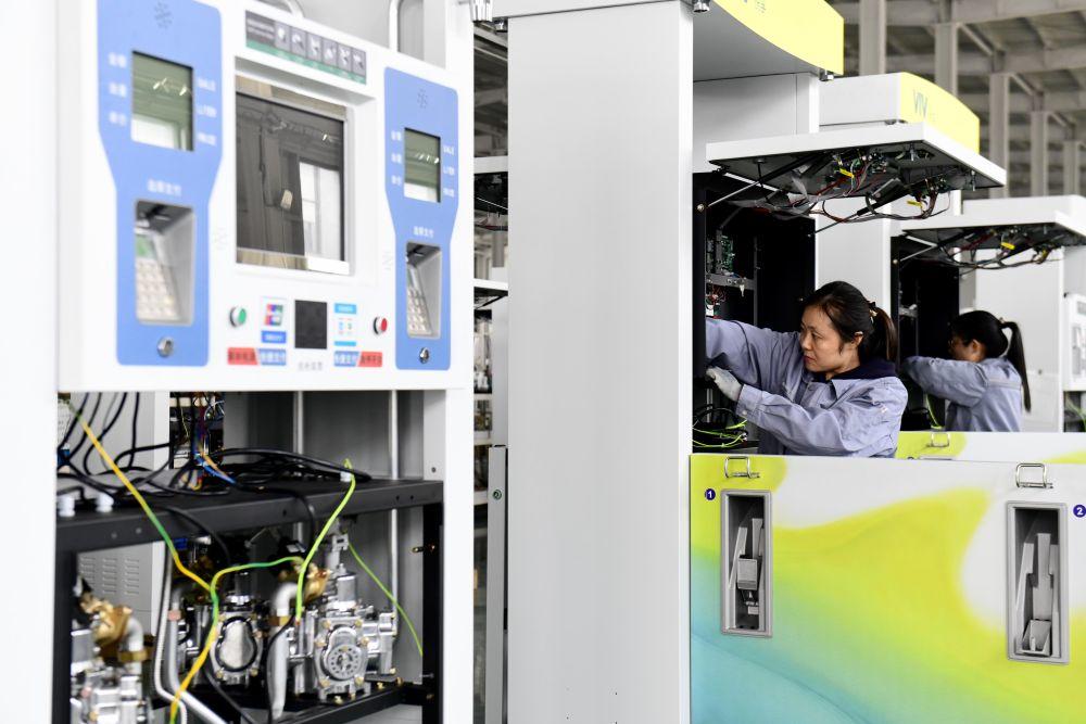 ↑ 3月27日,在日照市莒县一家企业,工作人员在装配加油机。