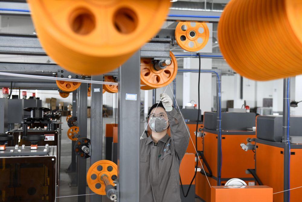 ↑ 3月27日,在日照市莒县一家企业,工作人员在3D打印线料生产线值守。
