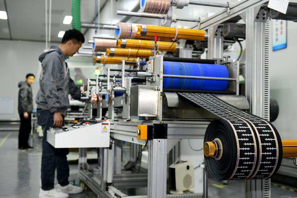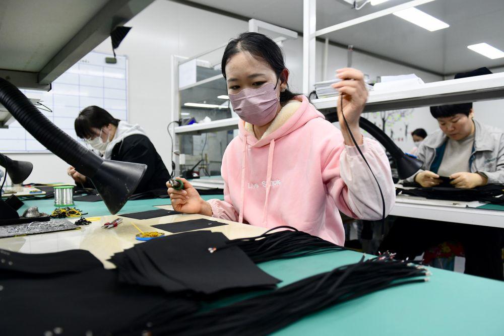 ↑ 3月26日,在日照市五莲县一家企业,工作人员在加工纳米发热面料。