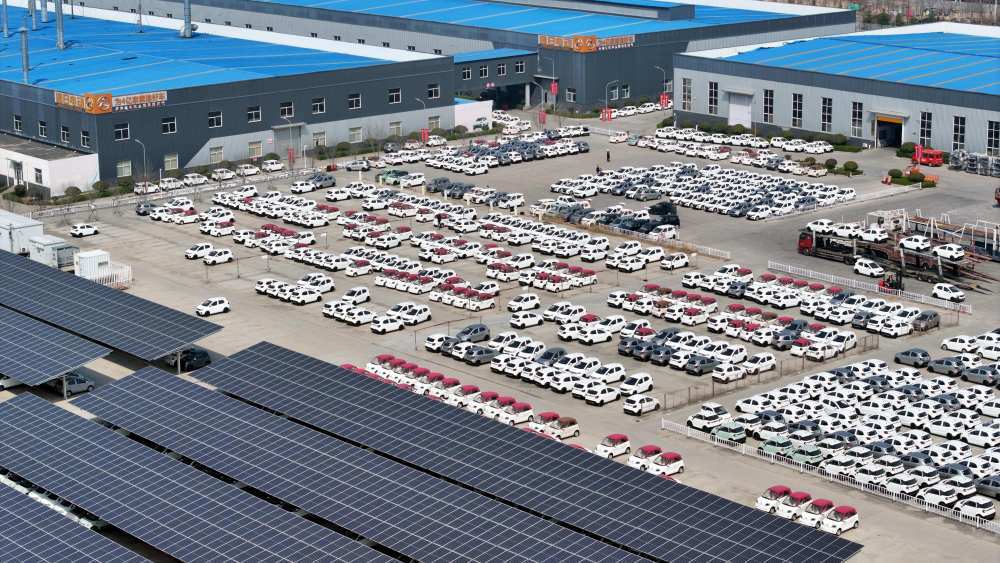 ↑ 3月26日,在日照市五莲县一家企业,下线的新能源汽车停放在厂区广场(无人机照片)。