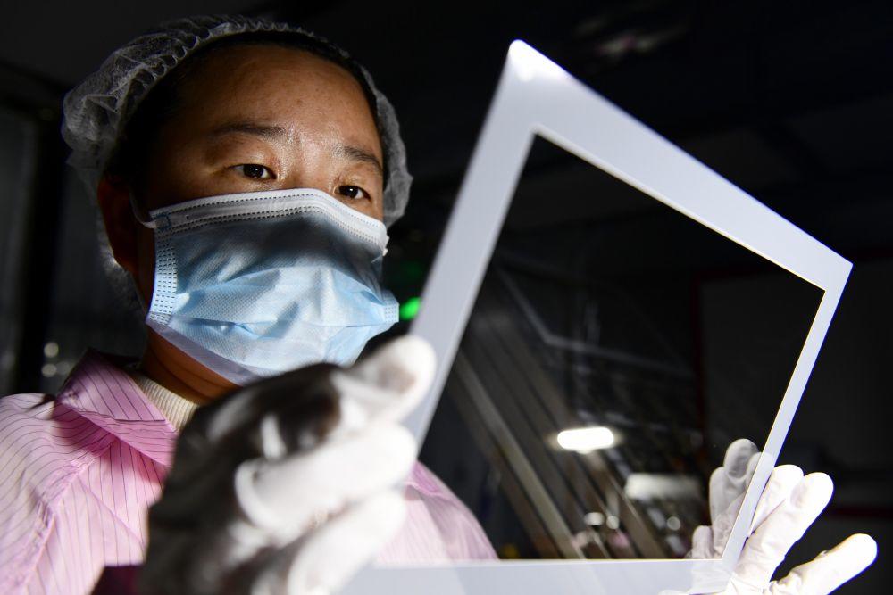 ↑ 3月27日,在日照市莒县一家企业,工作人员在加工触摸屏。