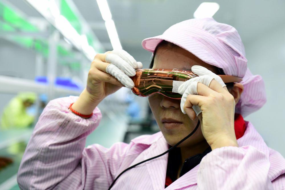 ↑ 3月26日,在日照市五莲县一家企业,工作人员在调试VR眼镜。