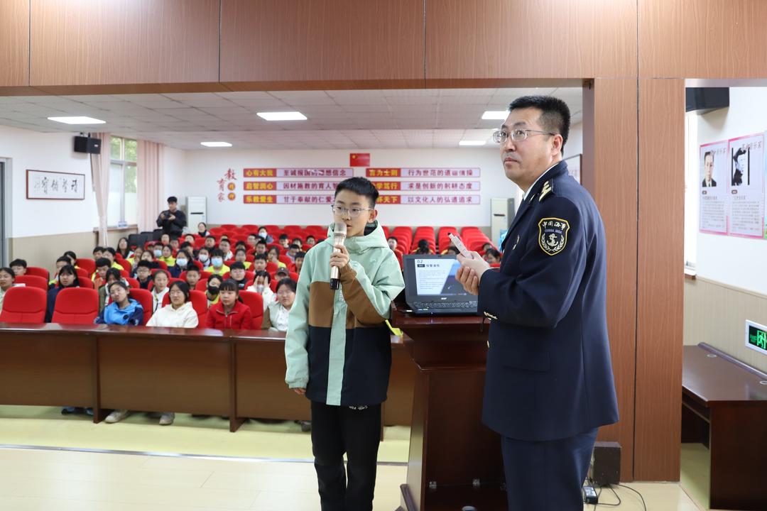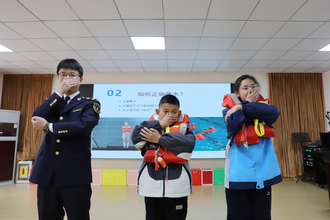 “船在海上可能发生什么危险?客船遇险如何逃生求生? 海上漂流如何获取淡水和食物?”“人在零度的水里能活多久? 对失温的人该如何正确施救”“什么是离岸流?如何逃脱离岸流?”“小伙伴意外落水如何正确施救……”海事志愿者结合《泰坦尼克号》《少年派的奇幻漂流》等经典电影和典型案例,视频加互动、理论加模拟演练,讲授水上求生、急救、乘船安全等基本安全常识和航海科普知识,并以贴近生活的案例,深入剖析了事故原因和教训,教授学生进行水上遇险后的自救和施救、发生溺水事故后的应急处置等,为学生带来了一场精彩生动的“水上安全和防溺水”技能培训,并向学校赠送了精美的航海科普卡片等礼物。一个小时的讲座,学生们全程高能互动,兴致满满。