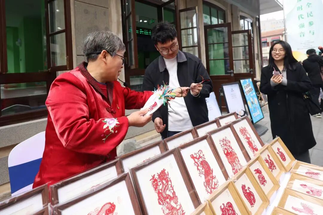 当天,掖县滑石雕刻、莱州毛笔、烟台剪纸、砂大碗、莱阳梨膏、古彩戏法、手作香、胶东花饽饽、果模……50个非遗、文创项目齐聚朝阳街,组成了一个全天开放的超大市集。这些承载着烟台记忆的“老手艺”,在朝阳街的青石板路上,与市民完成了一次近距离对话。
