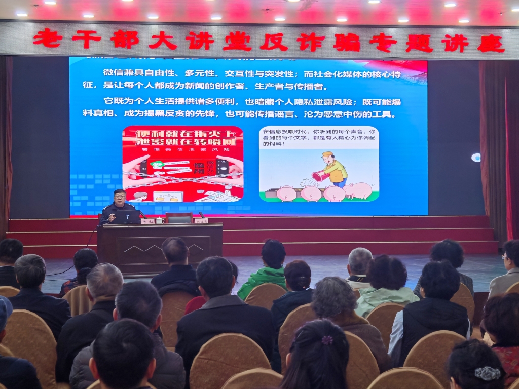 她强调,当前诈骗团伙已形成专业化运作模式,集结心理专家、数据分析师、专业编剧等人员组团设局,精准拿捏群众的孤独、贪婪、恐慌等情绪实施精准诈骗。尤其在人工智能全面渗透的背景下,AI技术正重塑电信网络诈骗模式,从源头改变其作案方式、涉案规模与危害程度,防范难度进一步加大。为让老同志们直观感受诈骗套路,陈虹警官结合多起针对老年群体的真实诈骗案例,以案释法、以案警醒,细致讲解案例背后的诈骗逻辑,引导老干部们强化个人信息保护意识,时刻保持警惕,不轻易相信陌生来电、不随意点击陌生链接、不向陌生账户转账,筑牢反诈思想防线。