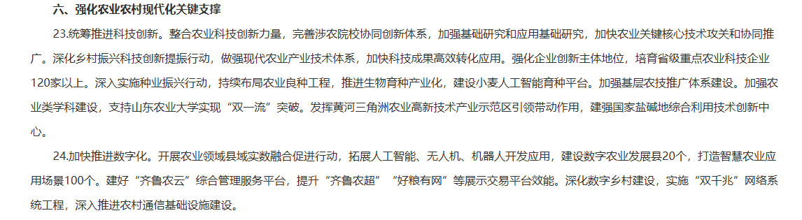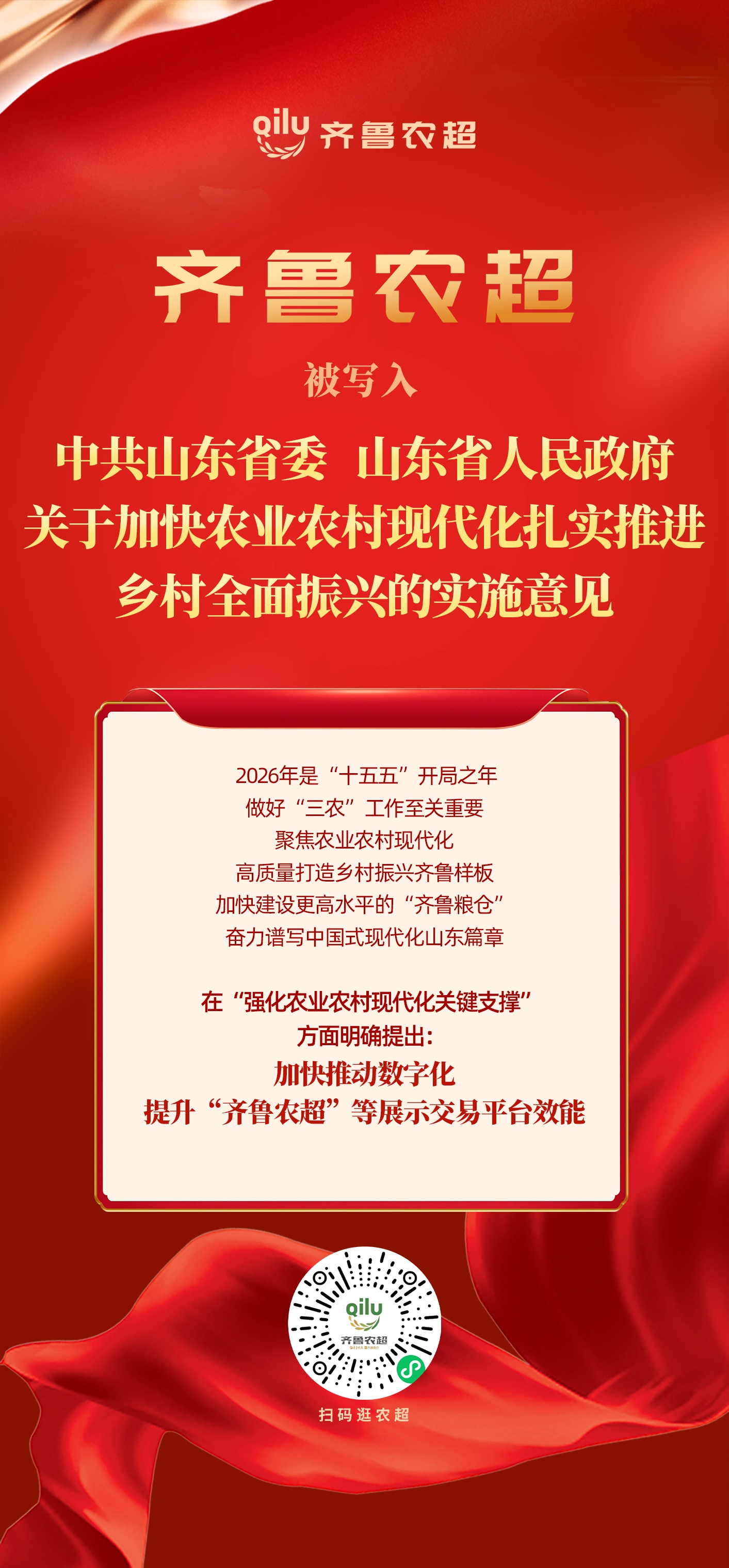 2026年3月30日,中共山东省委、山东省人民政府印发《中共山东省委 山东省人民政府关于加快农业农村现代化扎实推进乡村全面振兴的实施意见》(以下简称《实施意见》)。该意见围绕加快农业农村现代化、扎实推进乡村全面振兴,结合山东实际,提出八大方面三十三条具体举措,其中在“强化农业农村现代化关键支撑、加快推进数字化”板块,明确提出:建好“齐鲁农云”综合管理服务平台,提升“齐鲁农超”等展示交易平台效能。这是“齐鲁农超”连续三年被写入山东省委一号文件。