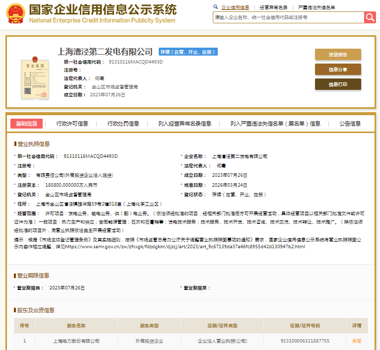 国家企业信用信息公示系统显示,上海漕泾第二发电有限公司成立于2023年,注册资本185800万元人民币,法定代表人何骞,由上海电力(600021.SH)全资持股。