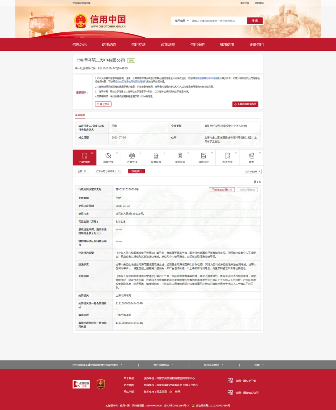 齐鲁晚报·齐鲁壹点记者于信用中国行政处罚栏获悉,3月2日,上海电力(600021.SH)旗下的上海漕泾第二发电有限公司(下称“上海漕泾第二发电公司”)收行政处罚决定书,处罚机关为上海市海洋局。