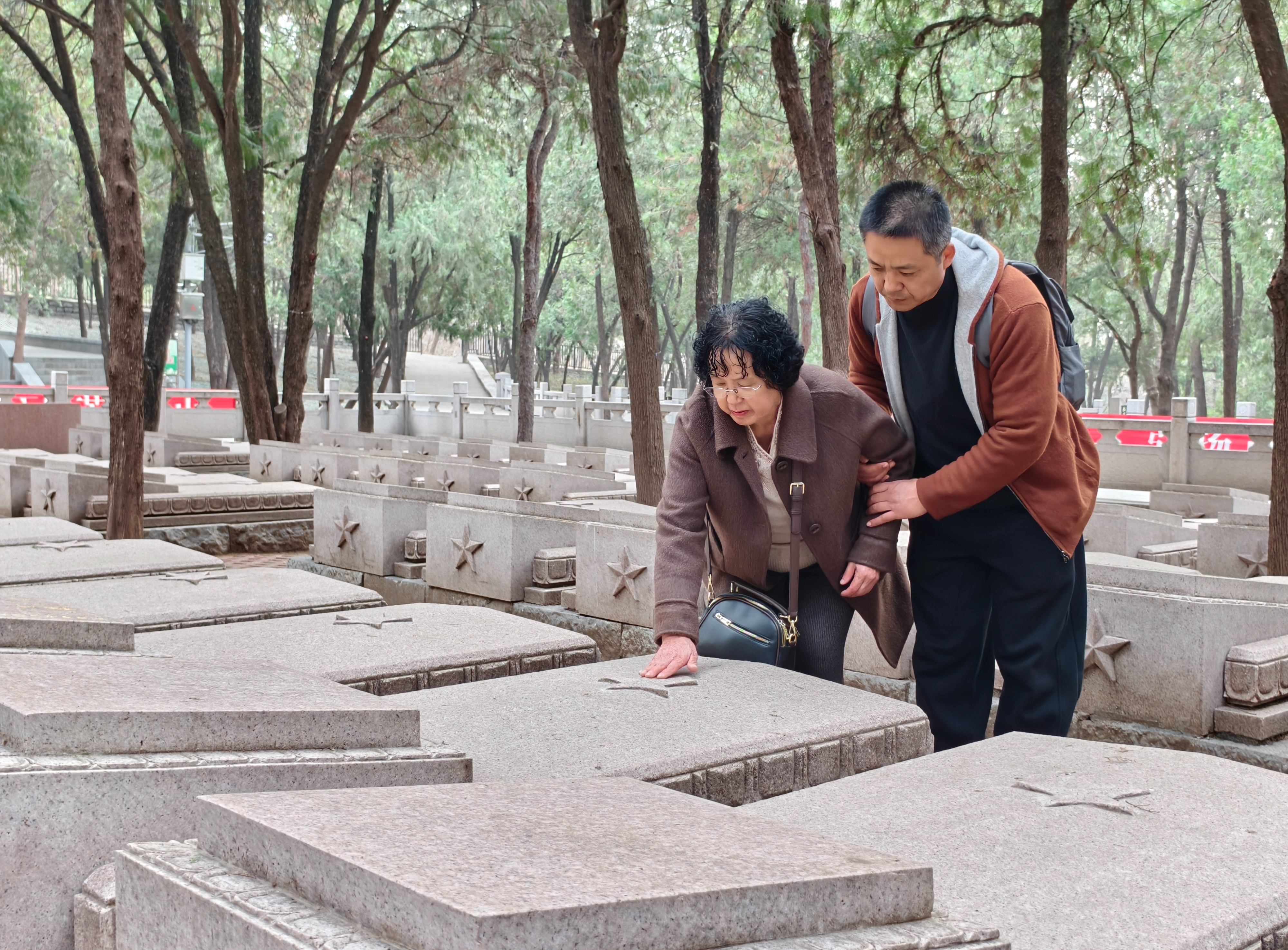 在济南革命烈士陵园,寻亲小组一行人来到了无名烈士墓前敬献鲜花。大家整齐肃立、低头默哀,向长眠于此的无名英烈深深鞠躬。高淑敏深情凝视,久久不愿离开。