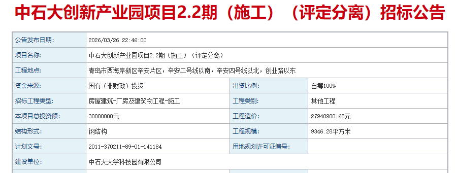 建面9346.28平方米!西海岸中石大创新产业园项目2.2期招标