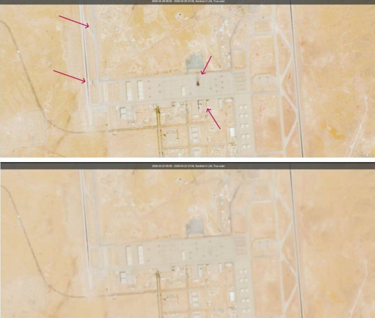 △伊朗方面发布打击沙特苏丹王子空军基地相关设施前后卫星对比图当地时间3月30日,伊朗方面发布卫星对比图,显示对沙特苏丹王子空军基地的美军相关设施的打击情况。伊朗称,一架加油机和一架预警机以及部分建筑物被击毁。此前一天,伊朗伊斯兰革命卫队发表声明称,沙特苏丹王子空军基地的美军E-3预警机已被完全摧毁,附近其他飞机也遭受严重损坏。