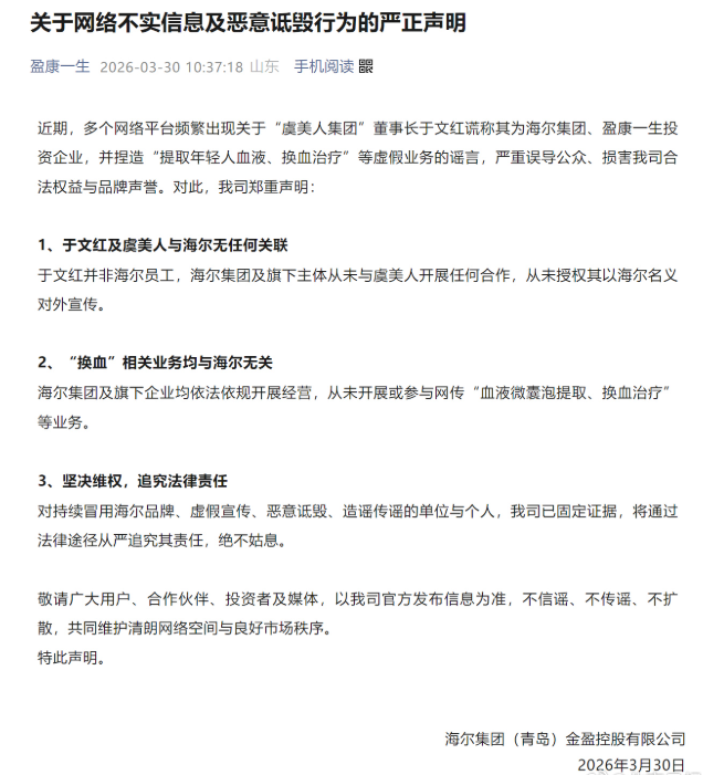 3月30日,海尔金控发布声明称,近期,多个网络平台频繁出现关于“虞美人集团”董事长于文红谎称其为海尔集团、盈康一生投资企业,并捏造“提取年轻人血液、换血治疗”等虚假业务的谣言。“公司声明,于文红并非海尔员工,海尔集团及旗下主体从未与虞美人开展任何合作,从未授权其以海尔名义对外宣传。”