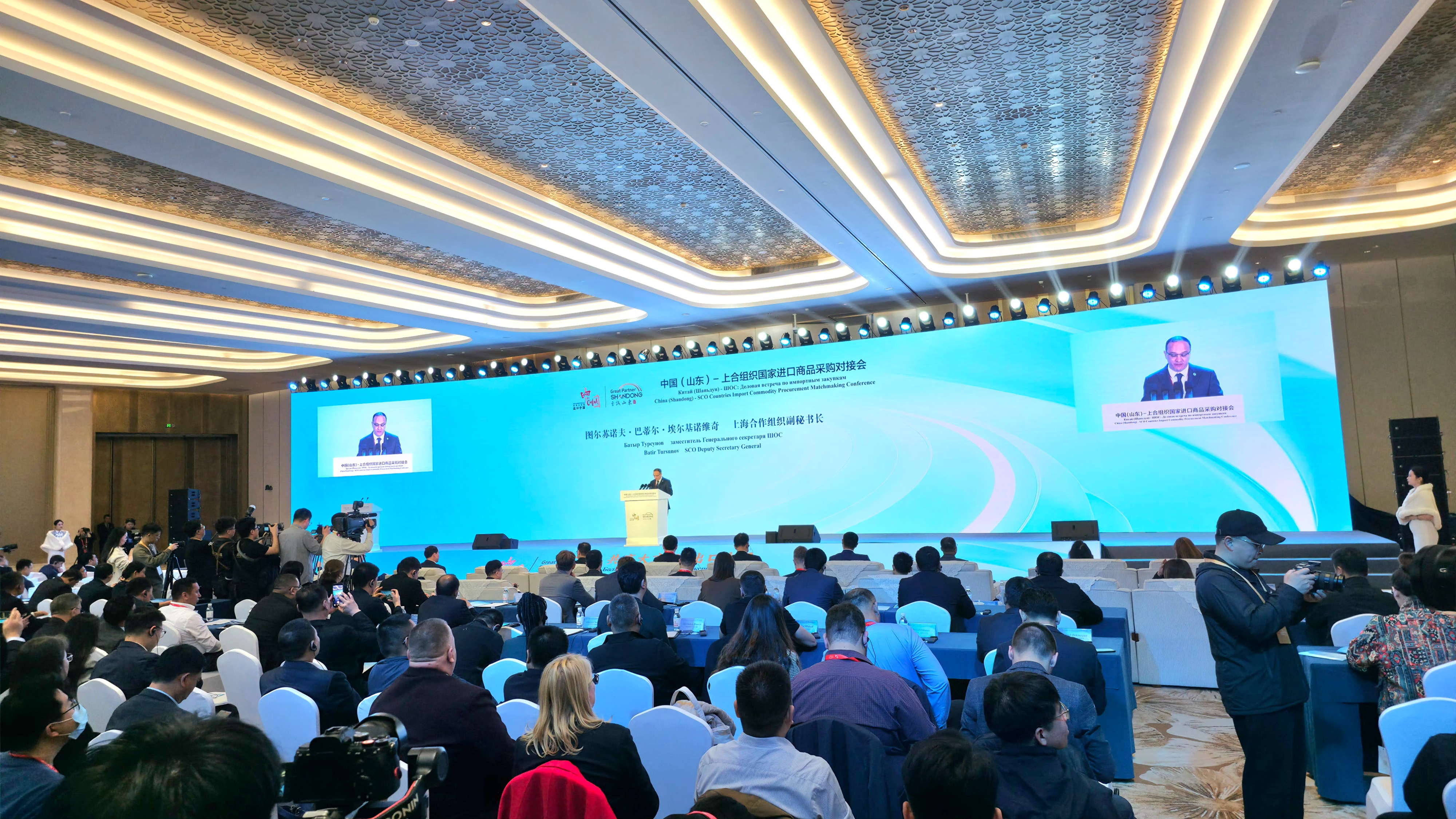 上海合作组织副秘书长图尔苏诺夫・巴蒂尔・埃尔基诺维奇,哈萨克斯坦共和国贸易与一体化部长沙卡利耶夫・阿尔曼・阿巴耶维奇,乌兹别克斯坦吉扎克州副州长贝克佐德・埃加莫夫,柬埔寨西哈努克省副省长索克・菲亚等中外嘉宾出席并致辞。白俄罗斯维捷布斯克州副州长尼基蒂娜·安吉丽卡·亚历山德罗夫娜视频致辞。各方围绕深化上合组织框架下地方经贸合作、扩大进口商品贸易、畅通产业链供应链等议题展开交流,一致认为山东与上合组织国家资源互补性强、合作潜力巨大,愿以此次对接会为契机,拓展合作领域、提升合作层次,实现互利共赢。