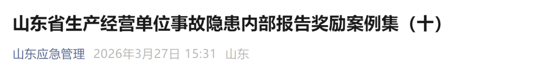 涉及泰安1家公司!山东公布生产经营单位事故隐患内部报告奖励典型案例